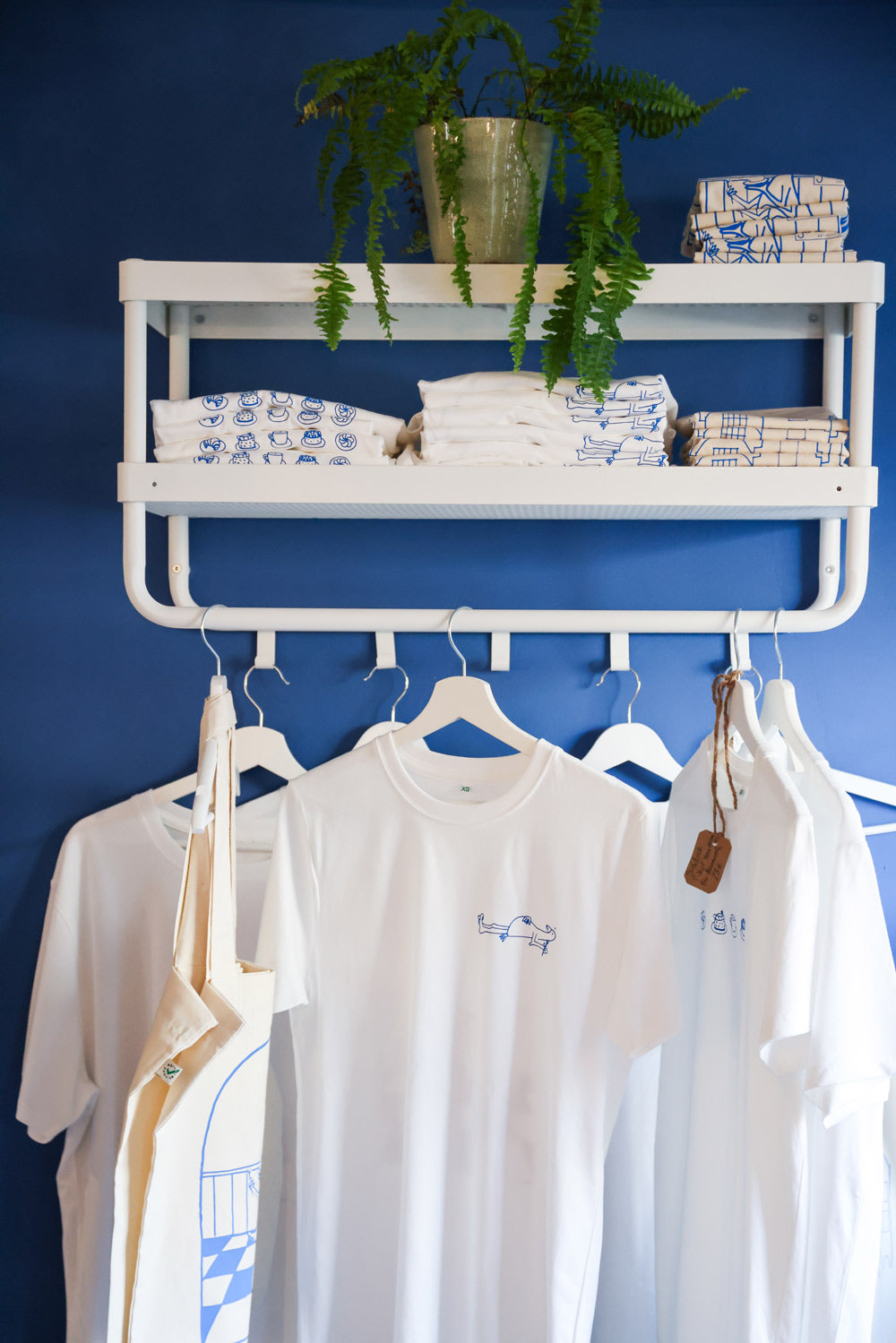 Neben den Törtchen, die du deinen Liebsten mitbringen kannst, haben wir auch einige Shirts und Taschen mit den Genießer-Gänsen Illustrationen von Jos Schwester Maya. Bedruckt wurden unsere Textilien von Paul von Hoya Design. Gedruckt wurde mit ausschließlich wasserbasierten Farben. Seine Rohlinge werden mit 100% regenerativen Energien produziert und bestehen entweder aus Bio-Baumwolle oder recycelten Materialien. Zudem findest du rechts davon auch noch ein Regal mit feinen abgepackten Köstlichkeiten. Das wechselt immer mal wieder. Unseren hauseigenen Kaffee könnt ihr ebenfalls in hübschen Tüten kaufen. Ob ganze Bohne oder eben bei uns gemahlen entscheidet dabei ihr. Es lohnt sich also vorbei zu schauen! Geschenkgutscheine stellen wir euch gerne mit gewünschtem Geldbetrag vorne an der Theke aus.